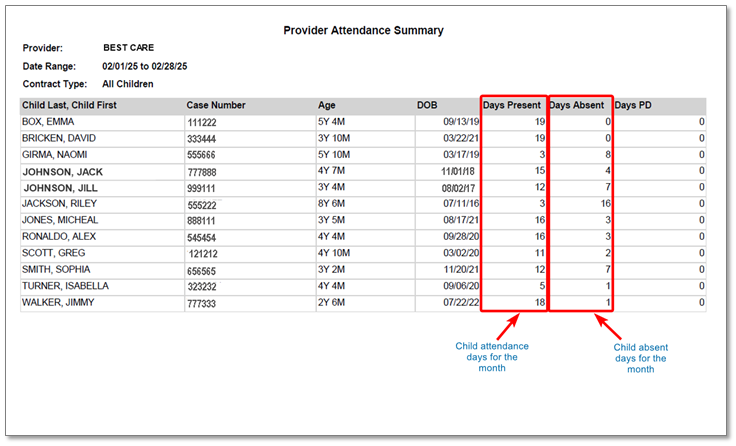 - Days Absent – The total number of days a child was marked absent in your CCMS.